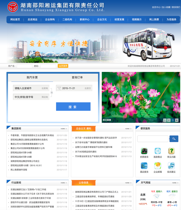 為加強(qiáng)企業(yè)信息化工作,利用網(wǎng)站推廣企業(yè)文化、提升內(nèi)部管理效率,湖南邵陽(yáng)湘運(yùn)集團(tuán)有限責(zé)任公司官方網(wǎng)站域名www.jcscdata.com于11月11日通過(guò)審核,網(wǎng)站次日正式上線(xiàn)發(fā)布。集團(tuán)公司與旗下客運(yùn)子公司均有獨(dú)立版面,可發(fā)布文件信息、動(dòng)態(tài)新聞等,今后集團(tuán)公司的公文、通知等將在網(wǎng)上發(fā)布,各子公司在網(wǎng)上查看下載,極大提升了文件發(fā)布的效率。該網(wǎng)站最大的特點(diǎn)是可以查詢(xún)邵陽(yáng)地區(qū)一二級(jí)車(chē)站所有車(chē)輛班次、時(shí)間、價(jià)格信息,并可在線(xiàn)購(gòu)票,購(gòu)票成功后憑密碼或身份證前往車(chē)站自動(dòng)取票機(jī)(或人工售票窗口)取票,該網(wǎng)站為旅客提供了一個(gè)便捷的購(gòu)票渠道。